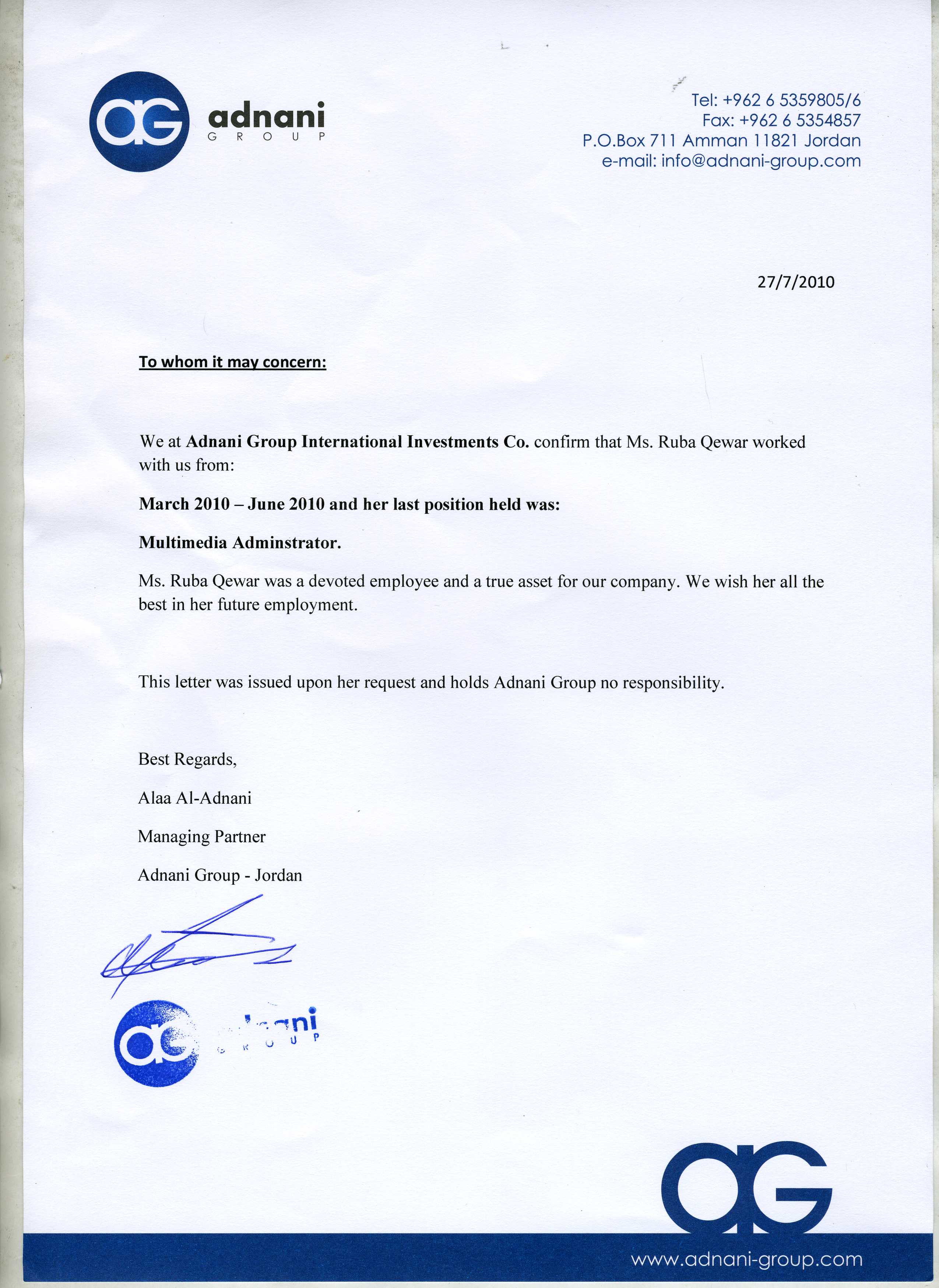 We at Adnani Group Internation Investments Co. confirm that Ms. Ruba Qewar worked with us from March 2010 to June 2010 and her last position held was "Multimedia Administrator". Ms. Ruba Qewar was a devoted...