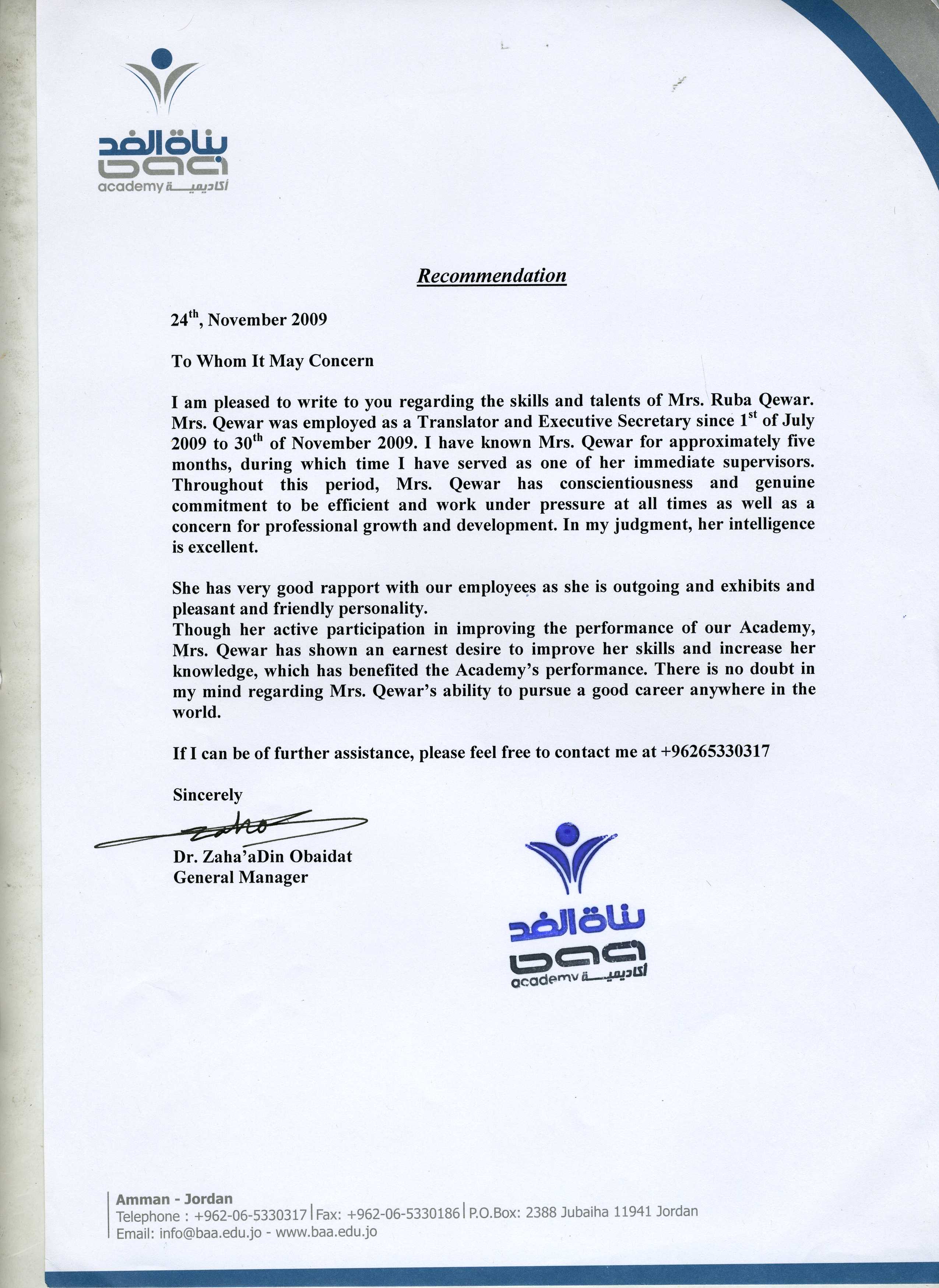 Read MoreI am pleased to wrote to you regarding the skills and talents of Mrs. Ruba Qewar. Mrs. Qewar was employed as a Translator and Executive Secretary since 1st of July 2009 to...