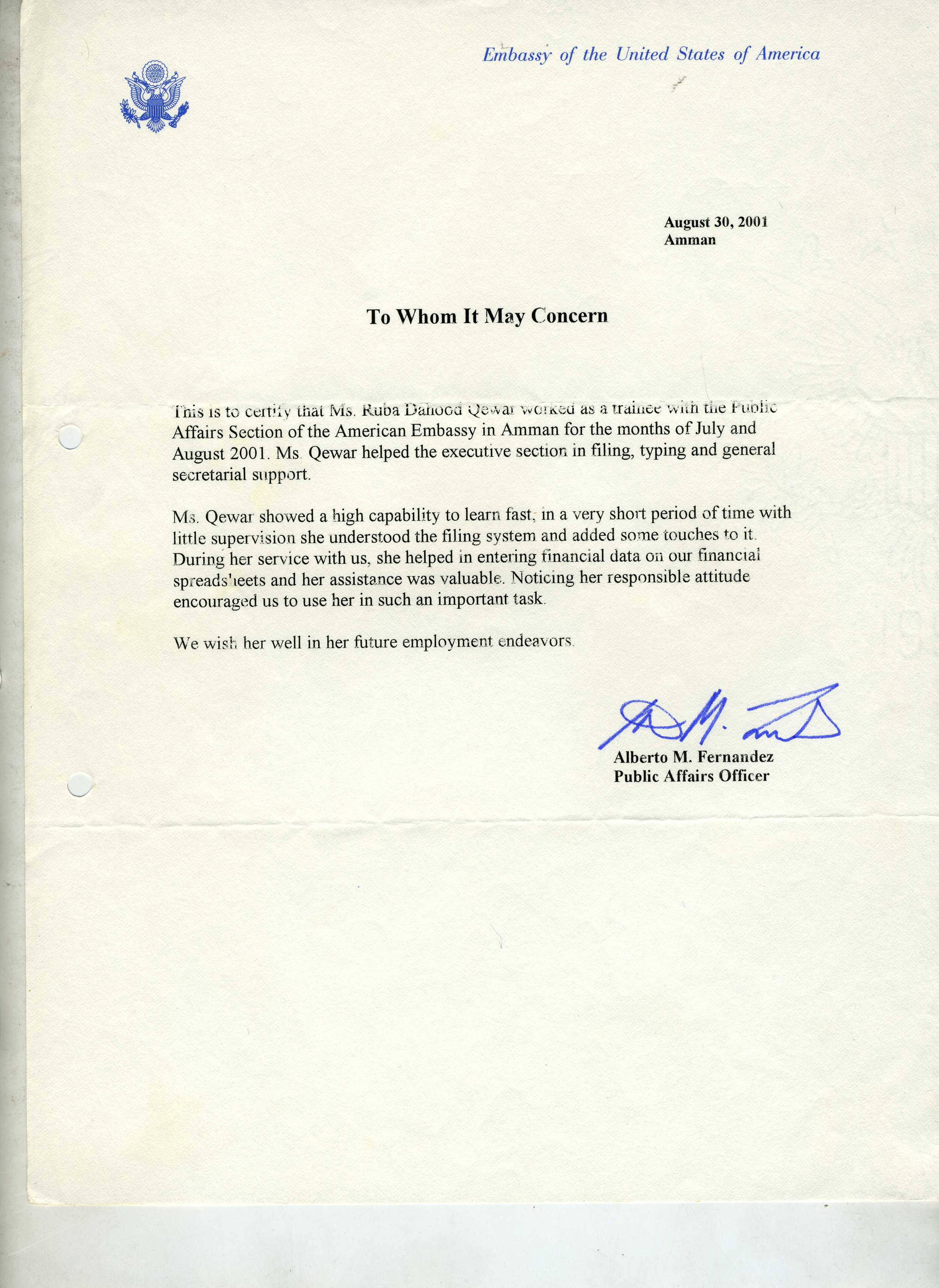 This is to certify that Ms. Ruba Qewar worked as an employee with the Public Affairs Section of the American Embassy in Amman for the months of July and August 2001. Ms Qewar helped the executive secion in...