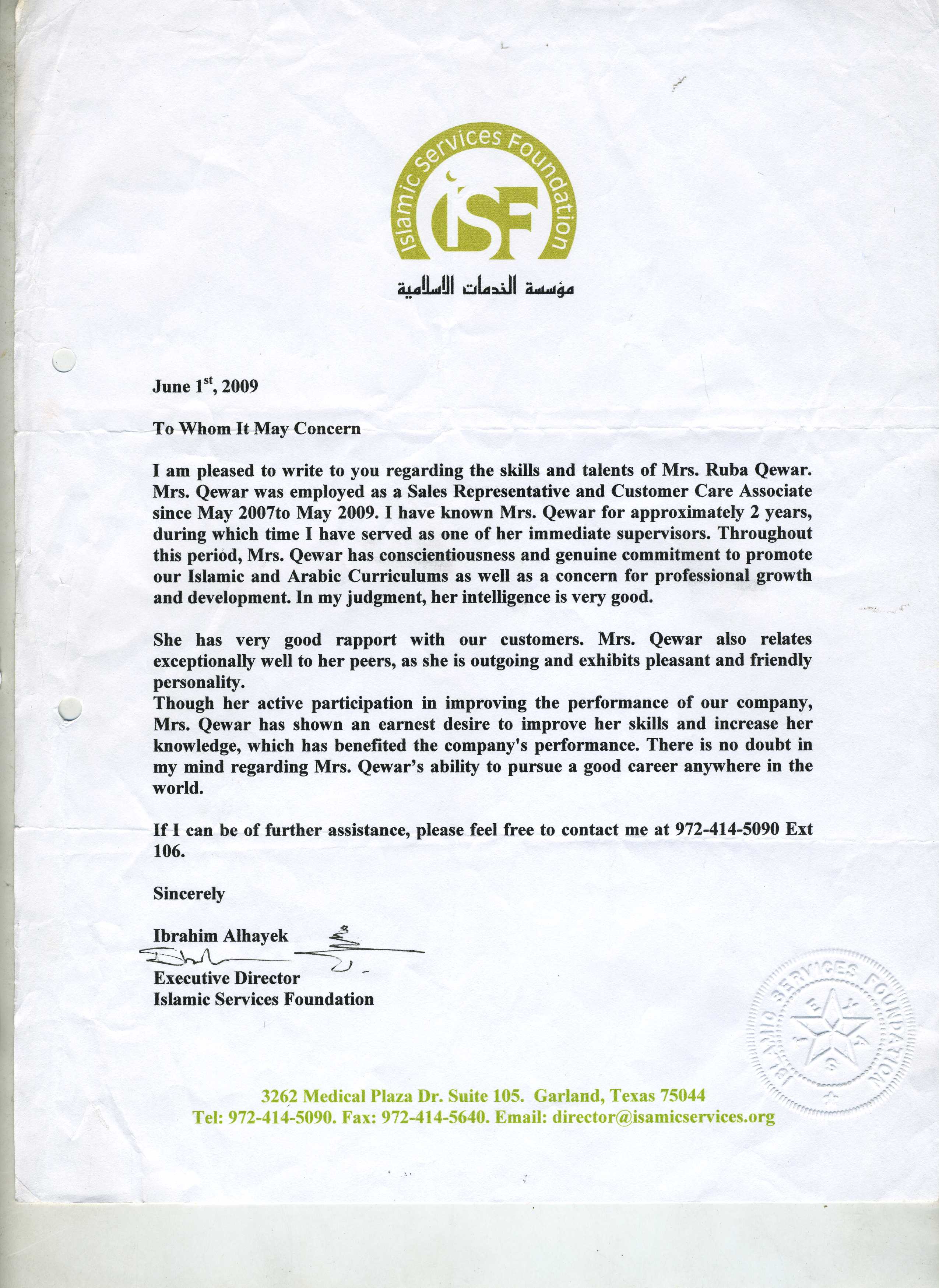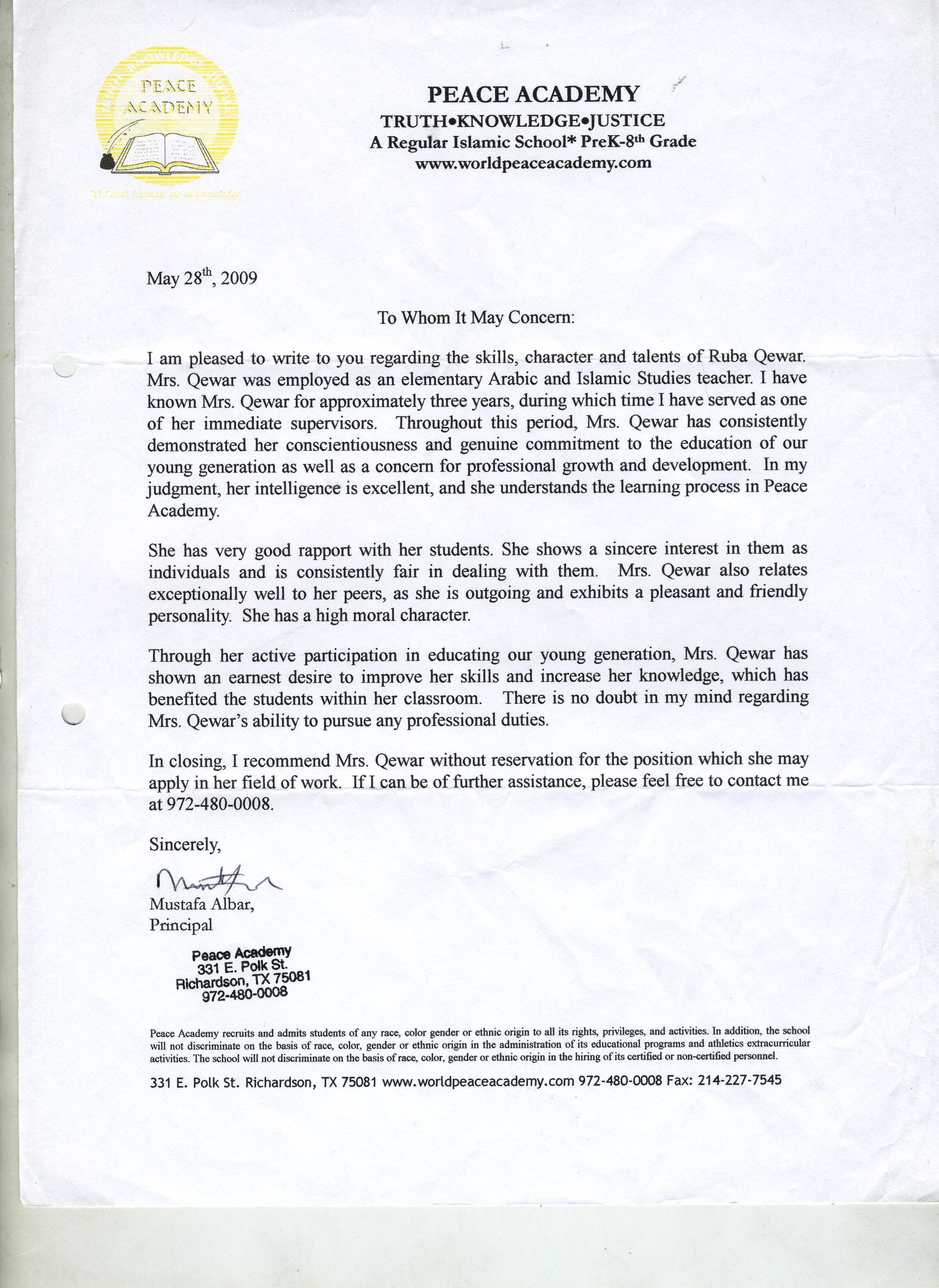 Read MoreI am pleased to write to you regarding the skills, character and talents of Ruba Qewar. Mrs. Qewar was employed as an elementary Arabic and Islamic Studies teacher. I have known Mrs. Qewar for approximately three years, during which time I have served as...