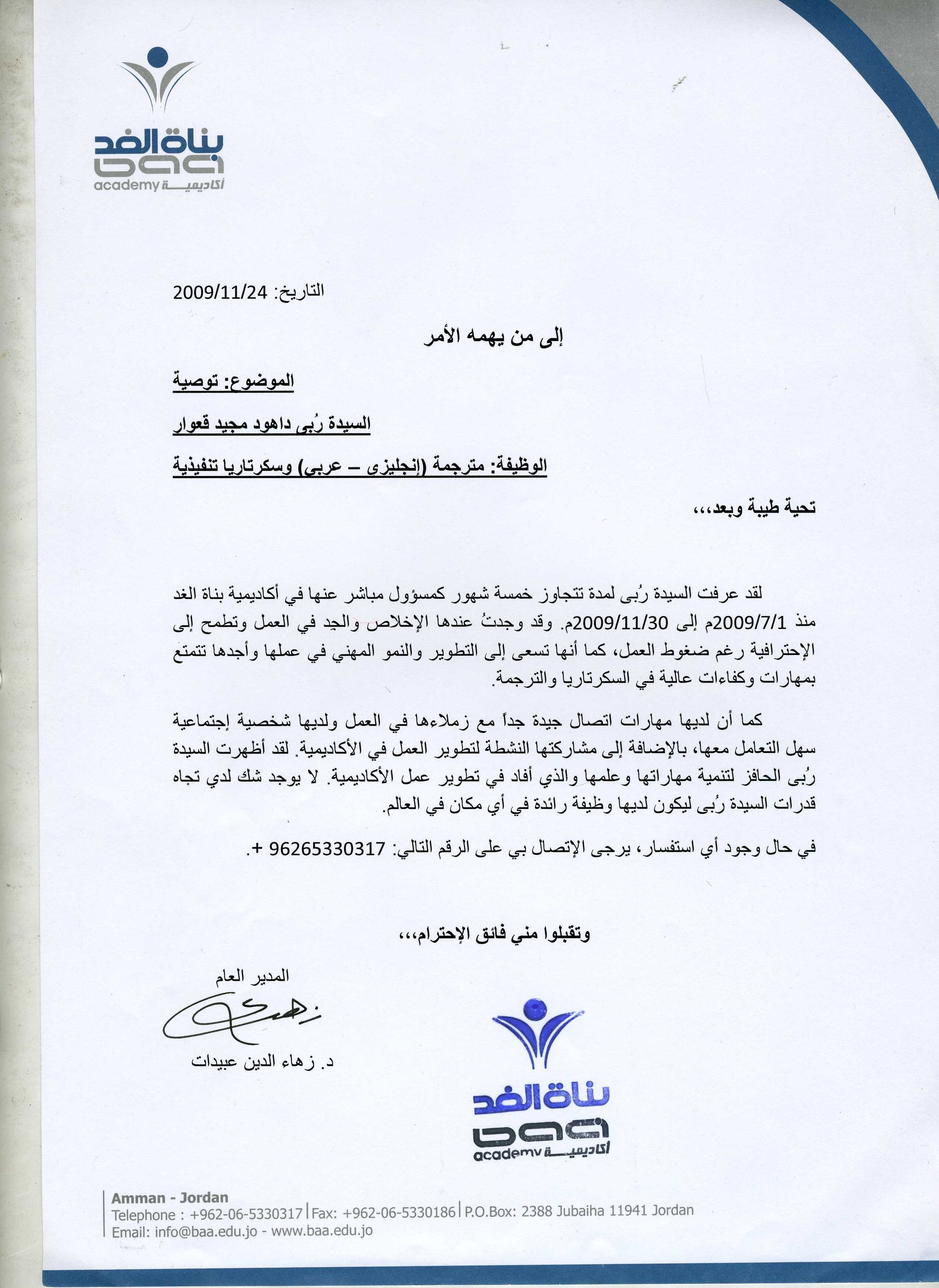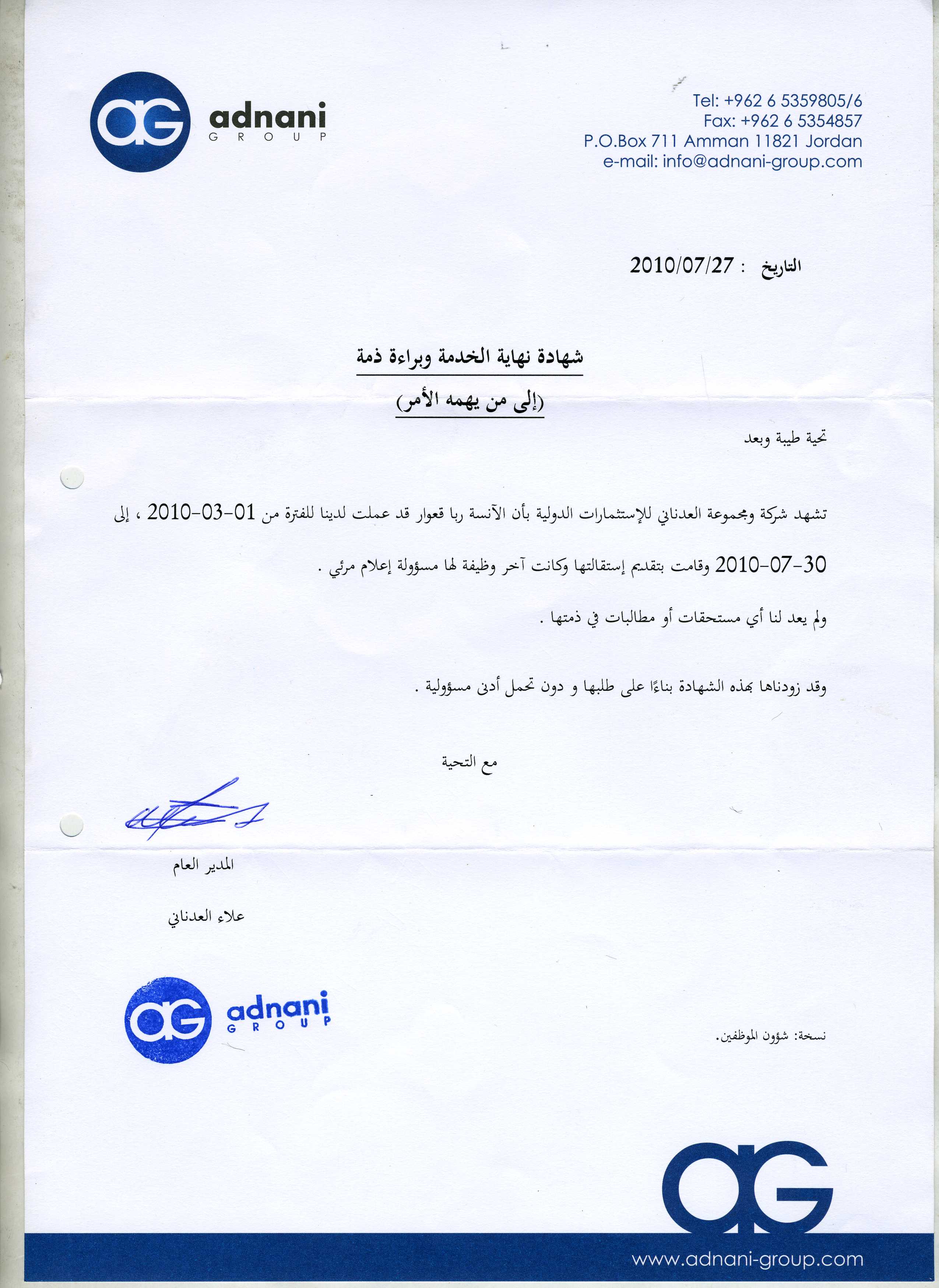 تشهد شركة ومجموعة العدناني للإستثمارات الدولية بأن الآنسة ربا قعوار قد عملت لدينا